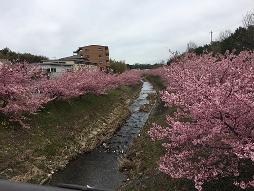 花川沿いの両岸に約1キロに渡って河津桜が400本植えられているという。