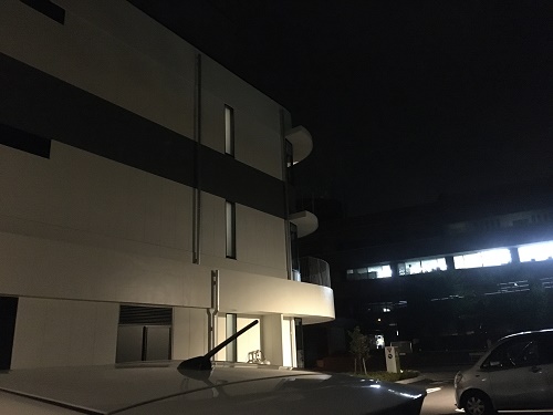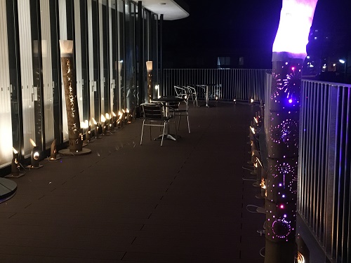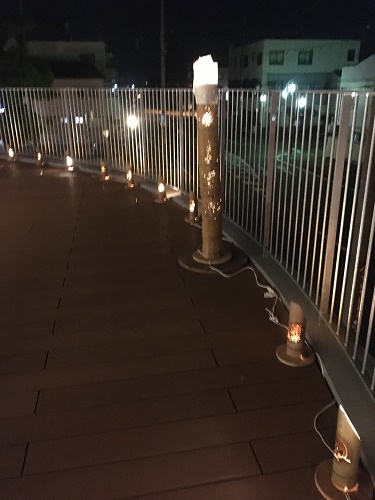 外階段に灯りがいくつかある。