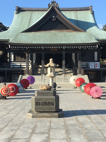 本堂の目の前にはいろいろな柄の番傘が置かれ、