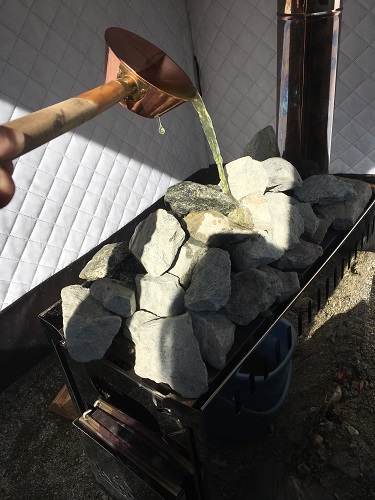 「そのバケツに入っているお茶をこの石(サウナストーン)にかけてみてください」と。