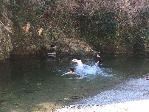 彼らは歓声を上げながら阿多古川へドボン!し対岸まで泳いでいる。