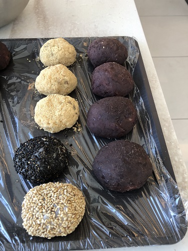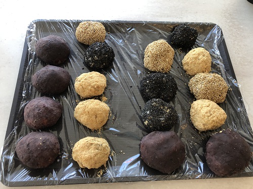 5.白ごま、黒ごま、きな粉などをまぶして完成