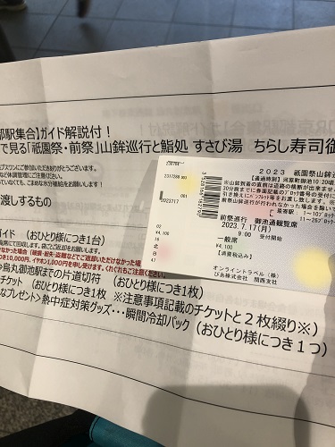 添乗員さんに名前を告げ、観覧席のチケット、イヤホンガイド、京都駅から烏丸御池駅までの片道切符、