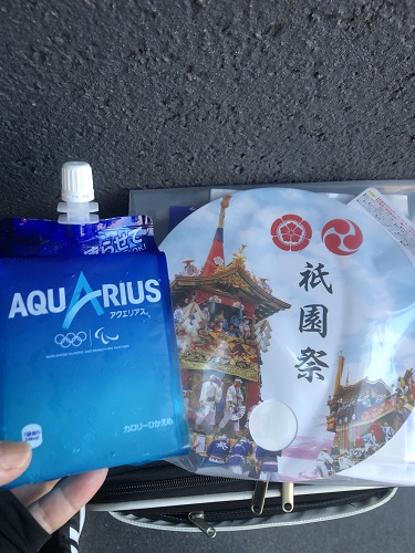 その時に凍らせたスポーツドリンク、ウチワ、祇園祭仕様の手ぬぐいなどを受け取った。