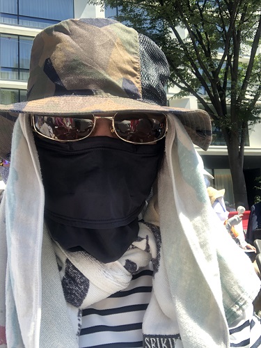 首にはタオルを巻き、日焼け防止用のフェイスカバー、サングラス。