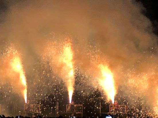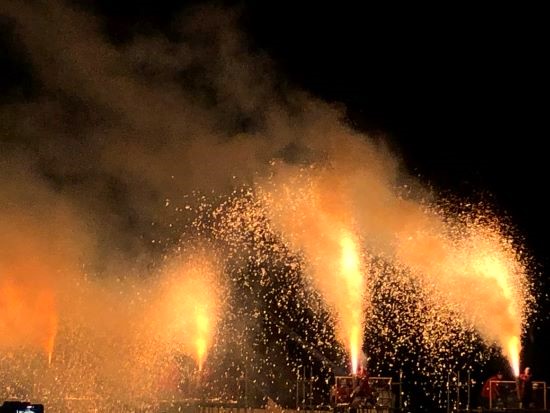 ステージ上では横一列に並んだ16基の手筒花火に点火、