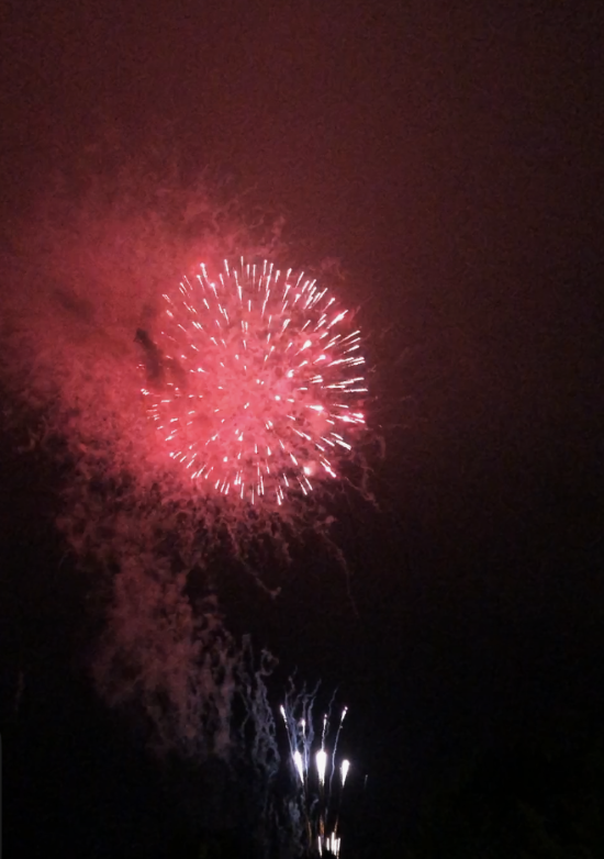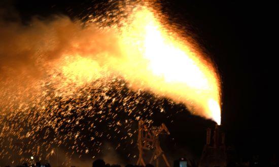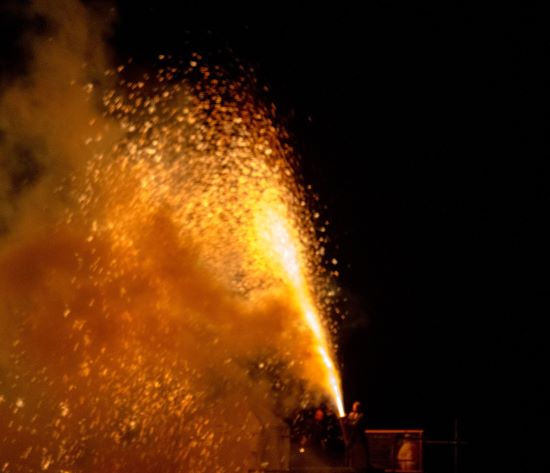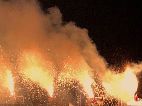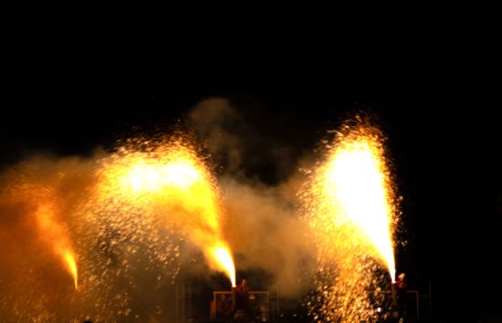 辺りが一斉に明るくなり、しばらくすると手筒花火から火柱が真上に噴き出す。