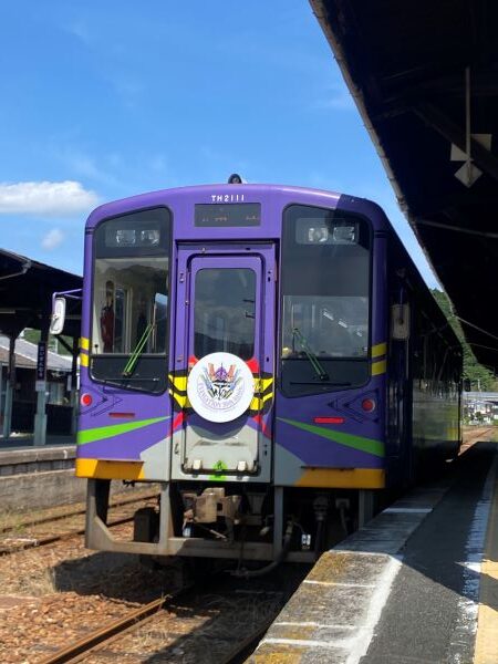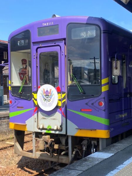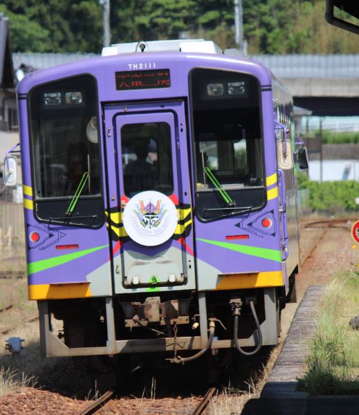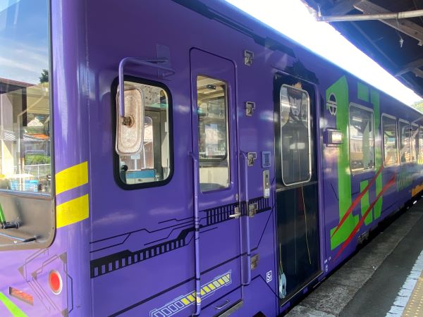 ホームに入り、入線したばかりの「エヴァンゲリオン ラッピング列車」を撮影。