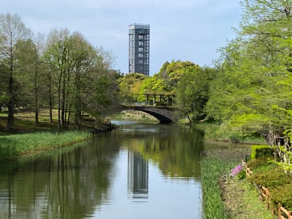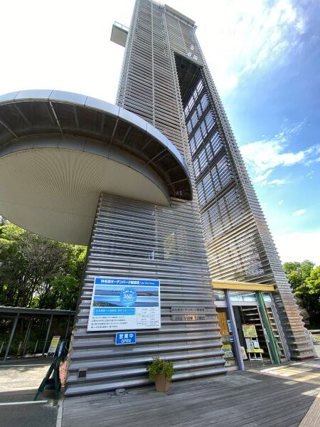 ネモフィラ畑から高さ50mの展望塔を見ると、