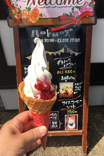 普通のミルク味のソフトクリームにばらジャムが乗っているもの。