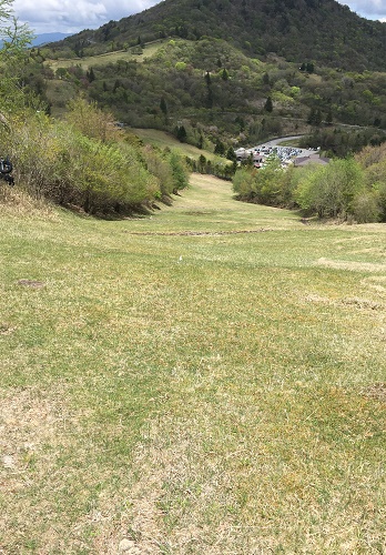 山頂から数分で滑り降りる斜面。