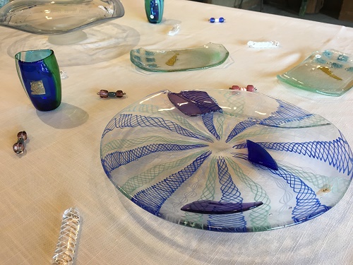 様々な色合い、様々な模様のガラス製品が並ぶ。
