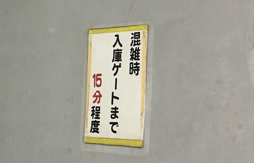 ふと横を見ると「混雑時 入庫ゲートまで15分程度」と貼り紙が。