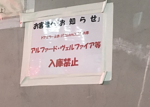 「ア○ファード、ヴェル○ァイア等 入庫禁止」と貼り紙が。