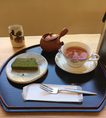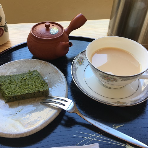 紅茶(hot)、有機抹茶のシフォンをオーダー。