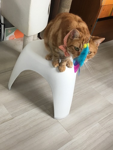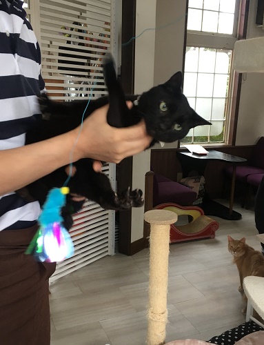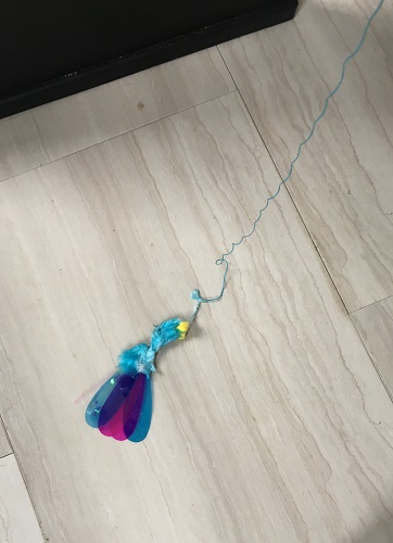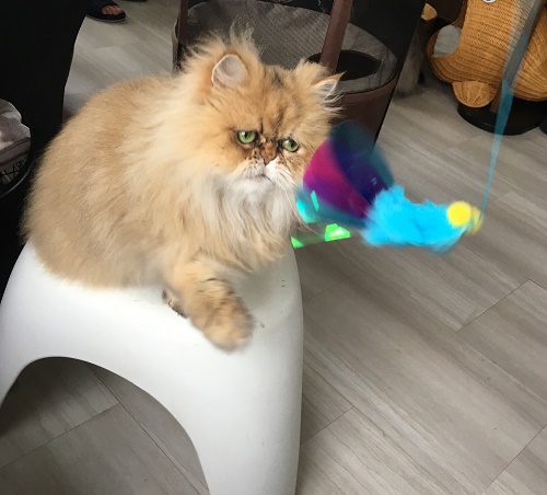 猫のおもちゃの使い方を店員さんに教えてもらい