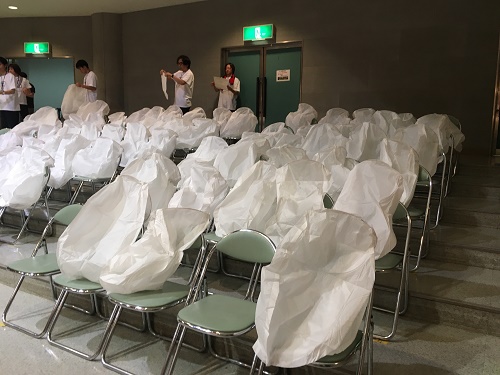受付となっているホールの床にはシートが敷いてあり、