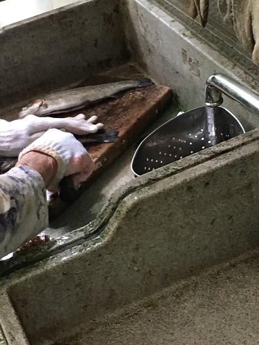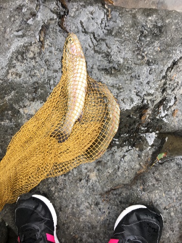 と針を外して血まみれ(滝汗)の魚を少し掲げると、