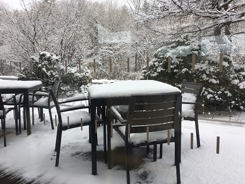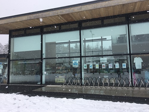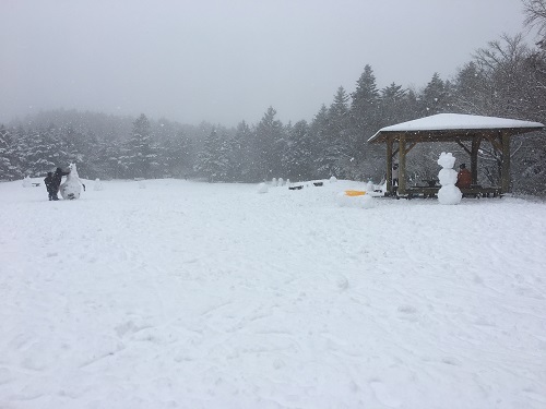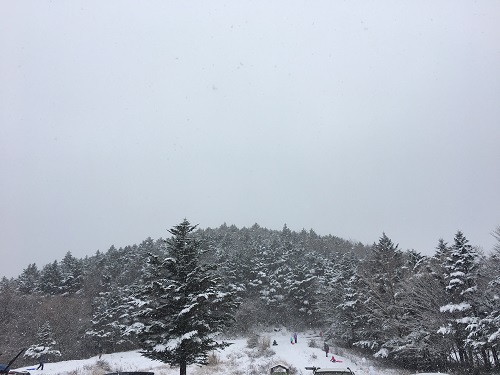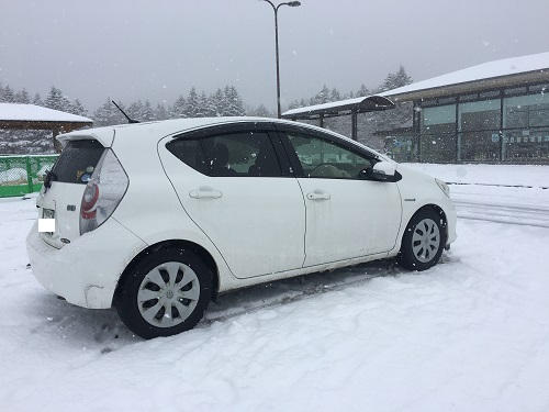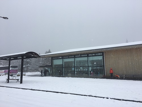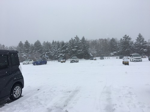 駐車場は雪が降っているのにかなりの台数が停まっている。