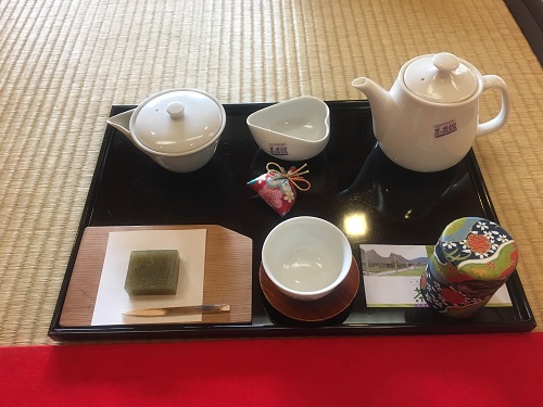 お茶とお茶菓子のセットが入ったお盆が運ばれてきた。