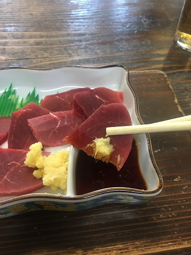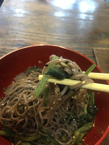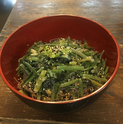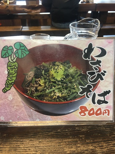 ぐるぐるかき混ぜてワサビやワサビの茎をよく混ぜて食べる。