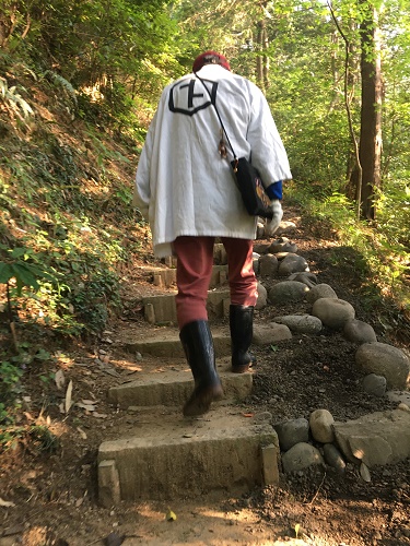 男性は神社の白い法被を羽織ってきた。