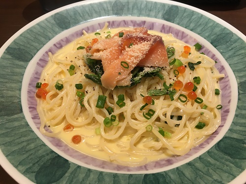 「サーモンとほうれん草のパスタ イクラ添え」を食べた。