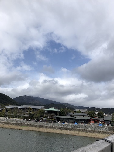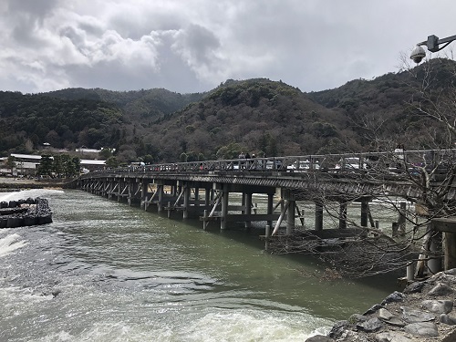 お店を見ながら渡月橋を渡る。