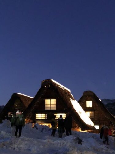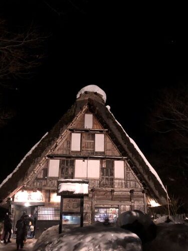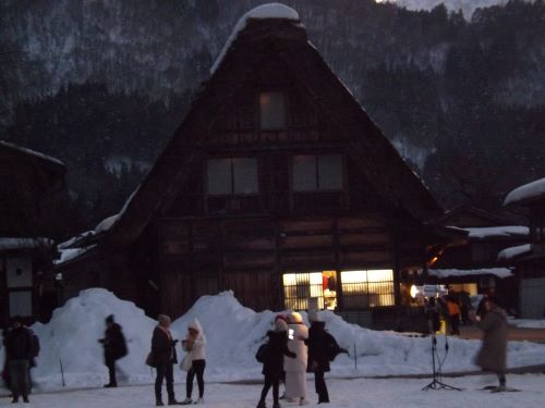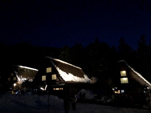 日が暮れてから、「合掌造り民家園」へ。