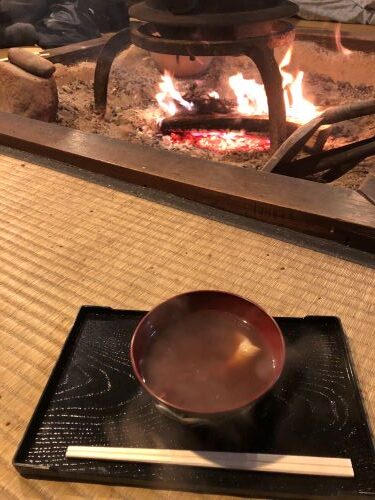 囲炉裏の温かさにほっとしながら熱々のぜんざいを食べる。