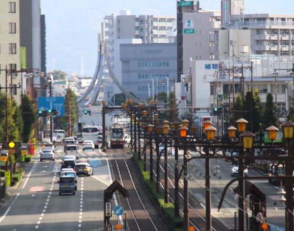 路面電車が中央を走り、両脇に車などが走る道路が見える。