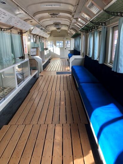駐車場横に電車の車両が置いてある。