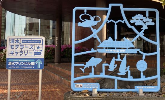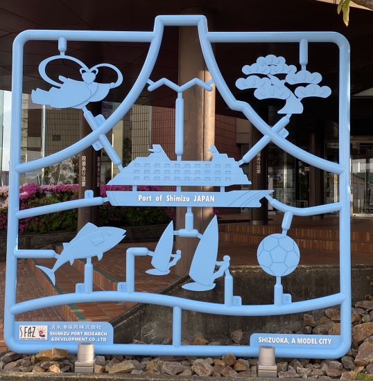 羽衣の松や豪華客船・鮪・サッカーなど清水の街をPRするプラモニュメント。