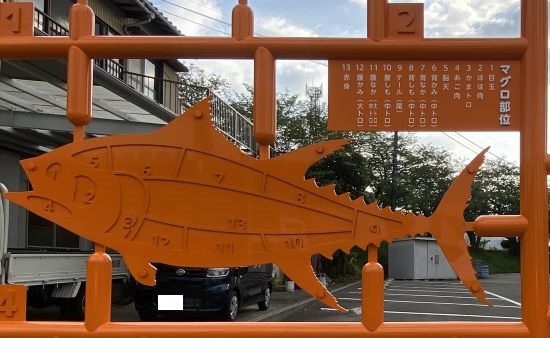 オレンジ色の高さ1.68m 幅1.88mのマグロの部位を示す図解や