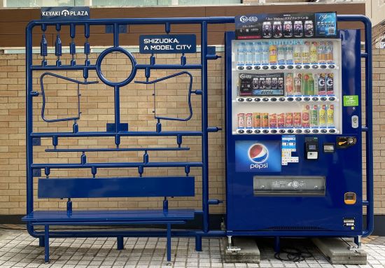 清涼飲料自動販売機とベンチシートのプラモニュメント。