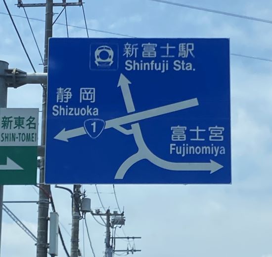 新幹線0系のアイコンが付いた新富士駅方面の矢印が頭、