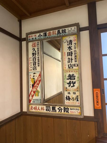 当時の看板や広告入りの鏡などいろいろなものを見ることができる。
