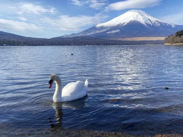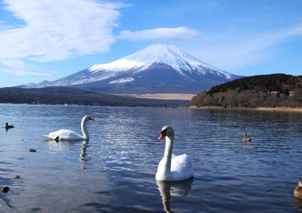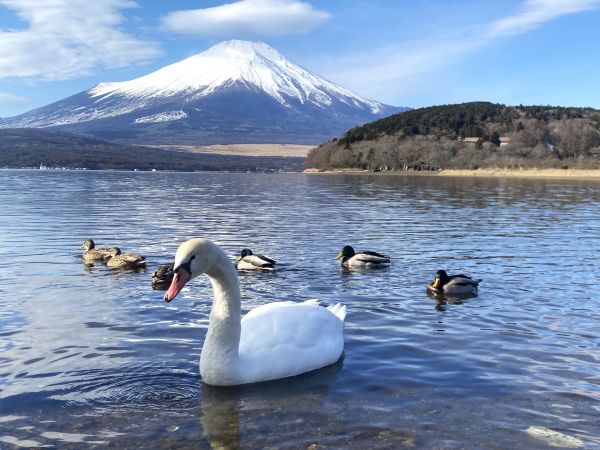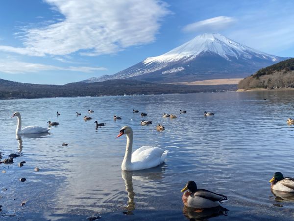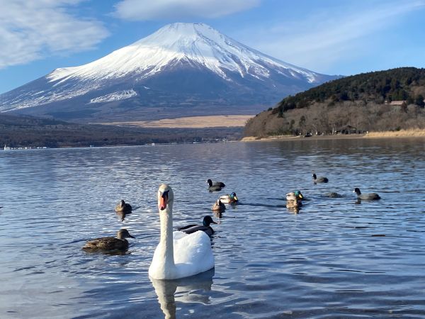 山中湖と富士山と白鳥などの水鳥が写っていた。
