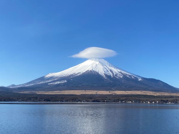 富士山の頭上には雲がかかっていて