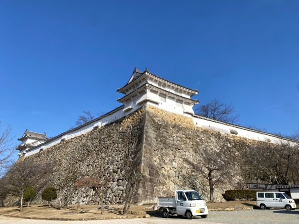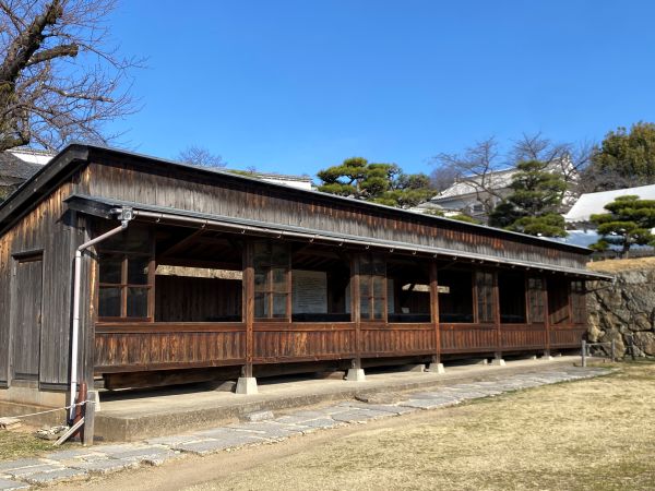 手前には太鼓櫓南方土塀があり右側が「への櫓(太鼓櫓)」、左側にあるのが