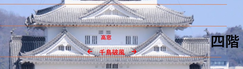 そして北側と南側の両脇(東西)に千鳥破風が2つずつ、合計4つ設けられている。