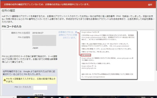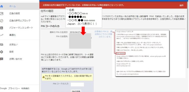 Google Adsense管理画面トップページに赤い帯で文章が書いてあるものが
