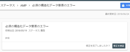 「必須の構造化データ要素のエラー」と表示されステータスは「警告」となってます。
