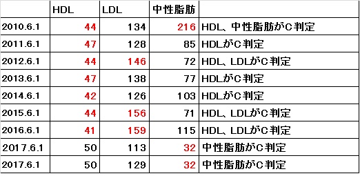 HDL(善玉)コレステロール値は昨年の同じ値。