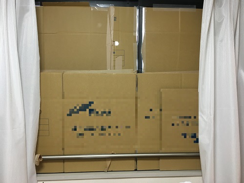前日までに窓の補強をして段ボールを貼り付けておいたのだ。
