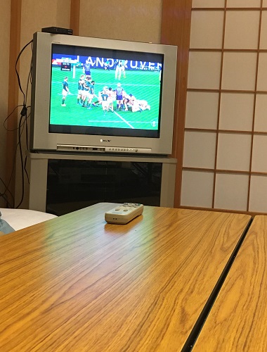 みんなは和室でラグビーW杯の試合を見ている。