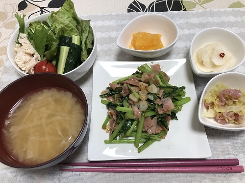 ニンニクスライスとベーコンで炒めてオイスターソースで味付け。