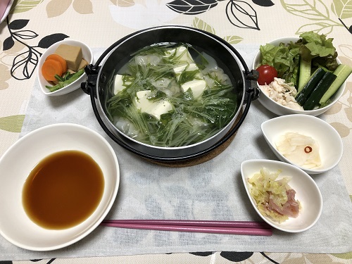 水菜をたっぷり入れた水餃子、カブの葉を添えた高野豆腐の煮物。