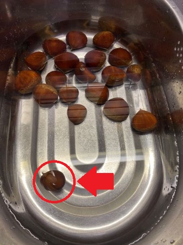 水に浮いた1個を除き、お湯の中に栗を投入!