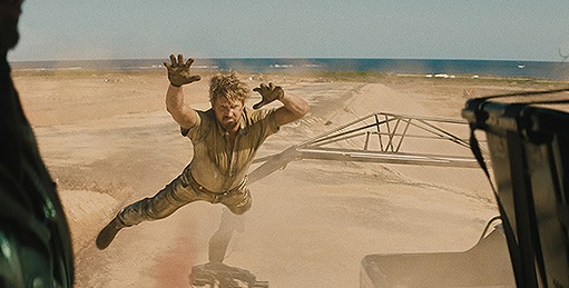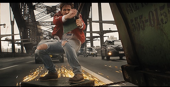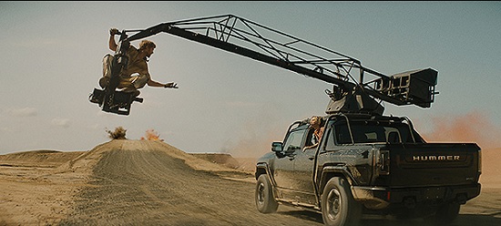 ジョディの運転する車とクレーンのアームでヘリに飛び移ったコルトは